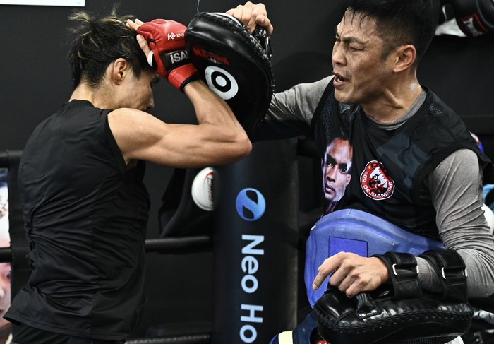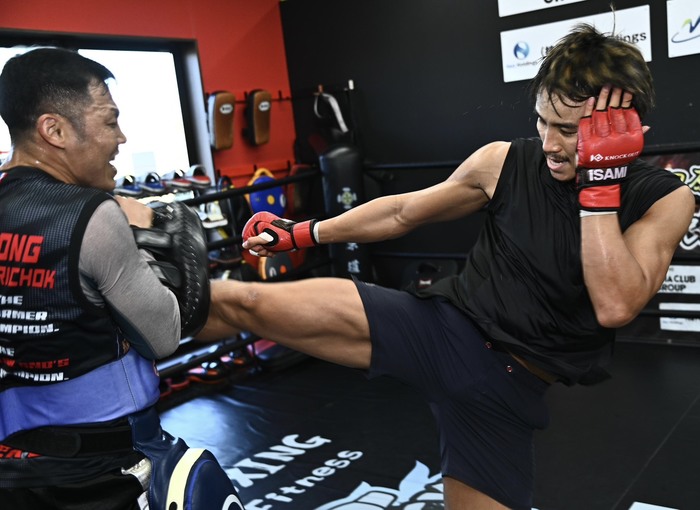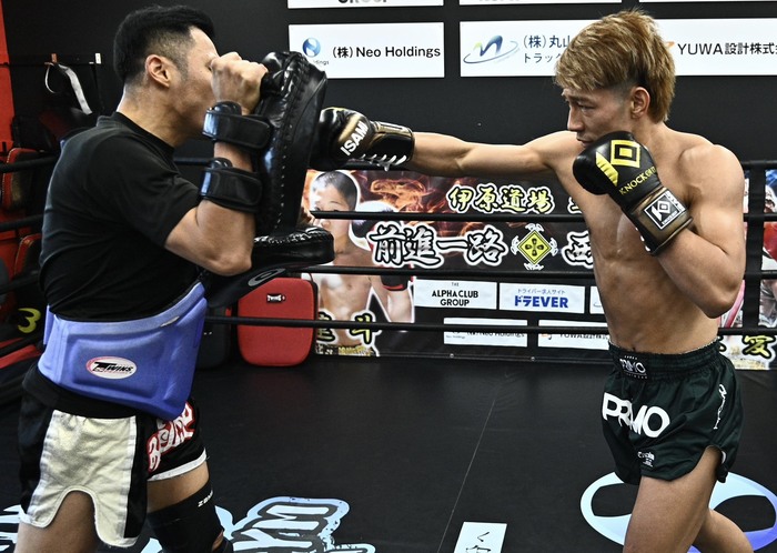 数年前までお互いに対戦をアピールしていた関係性だったが、共通のタイ人トレーナーのノッパデッソーンを通じて一緒に練習する機会が増えていった軍司と龍聖。この日の公開練習の場となった伊原道場 越谷は二人の練習拠点の1つとなっており、ノッパデッソーンを相手に激しいミット打ちを披露し、好調をアピールした。